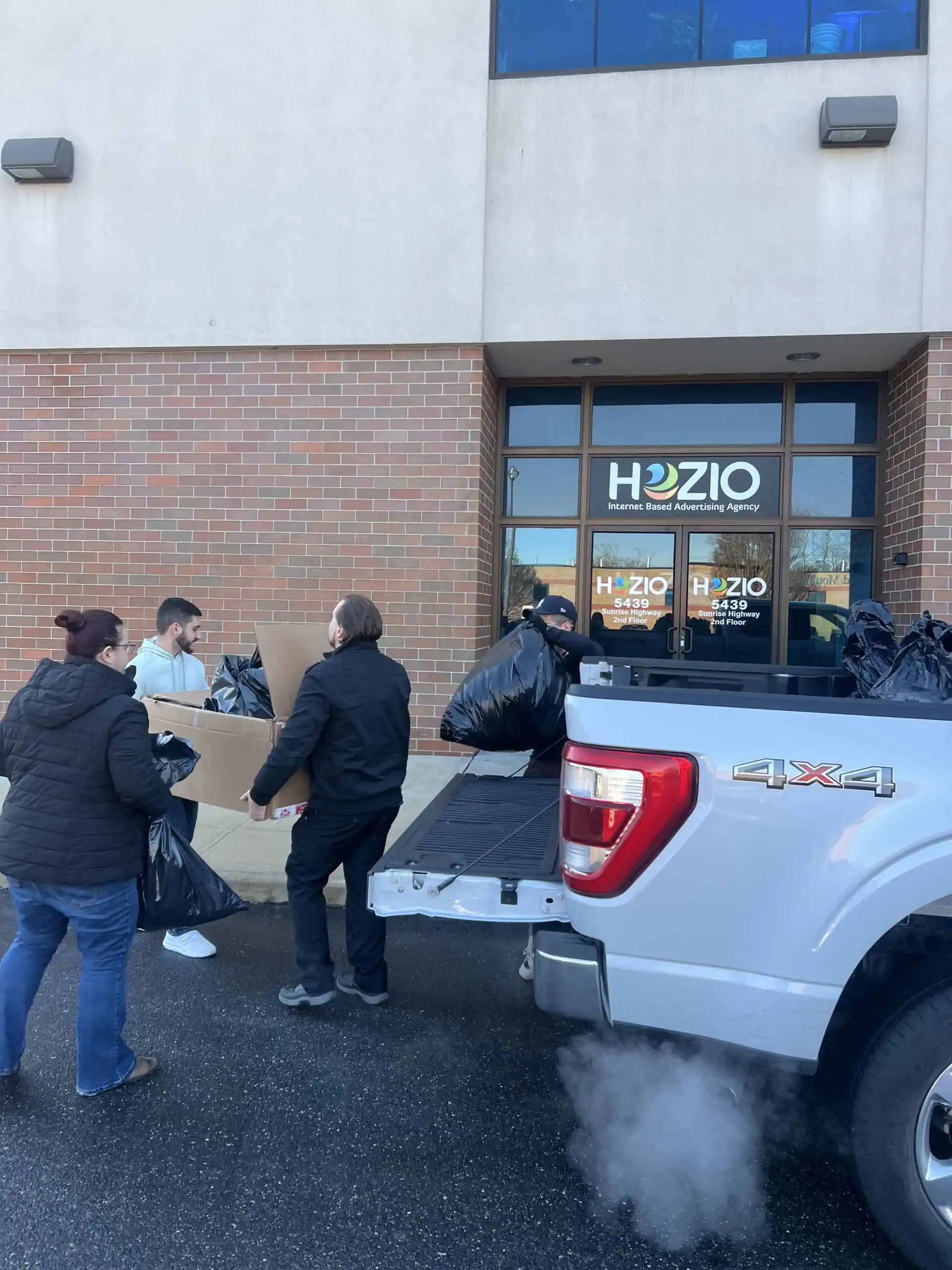 Three people unload bags and boxes from the back of a gray pickup truck outside a brick building with large windows and a sign reading "HOZIO." Steam is visible near the truck’s exhaust.