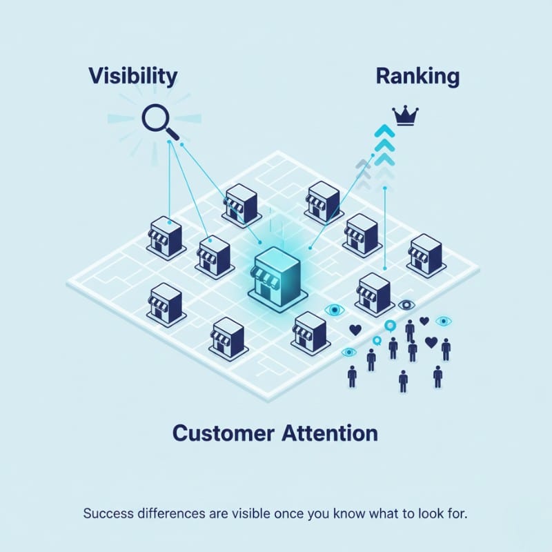 Isometric illustration of several storefronts, one with a crown and highlighted to show high visibility and ranking, attracting more customers while others attract fewer. Text reads: "Competitive Landscape" and "Customer Attention.