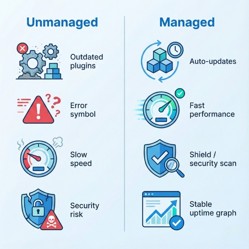 WordPress powers millions of websites, but it requires ongoing care. Updates need to be applied carefully. Security vulnerabilities need monitoring. Backups need to happen regularly. Performance needs optimization.